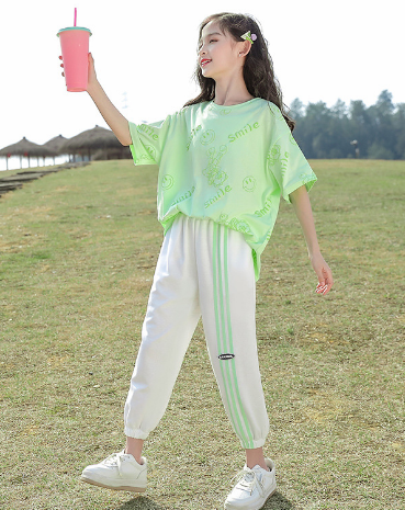 Smile三杠短袖套装-粉色,Smile三杠短袖套装-绿色,Shout女童套装-白色